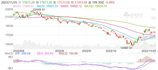 国内方面,疫情反弹压制情绪。国内疫情新增病例逐步攀升至新高,其中北京、重庆、郑州和广州新增病例持续走高;在此背景下,多地疫情防控措施更是有收紧趋势,层层加码现象仍普遍存在,实际走向与出台不久的疫情防控二十条优化措施几乎南辕北辙,这必然会引发市场对经济及盈利修复前景的忧虑。经济数据方面,国家统计局周日发布的数据显示,1-10月份,全国规模以上工业企业实现利润总额69768.2亿元,同比下降3.0%。事实上,从10月的一系列经济数据不难看到,消费、投资、出口三驾马车全面下滑,考虑到近期国内疫情散发多发,世界经济衰退风险加剧,工业企业效益恢复面临更大的压力。