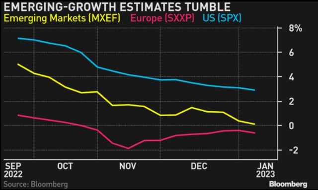 对 2023 年全球收益的悲观情绪正在加剧,而且这一趋势似乎不会很快逆转。 据彭博社报道,自 9 月底以来,美国的利润增长预期已被削减一半以上,仅略低于 3%,而新兴市场的预期受到的打击更大。 分析师认为欧洲的利润略有下降。