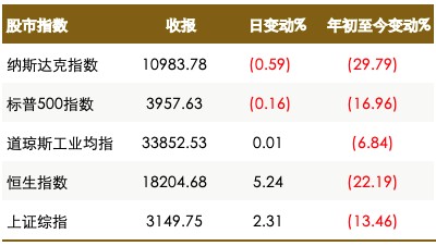 l 市场等待周三鲍威尔公开讲话,美股多数收跌。中国防疫限制松动前景提振风险偏好,中概股大涨,拼多多、京东领涨,美元指数下跌,美国国债遭抛售,价格下跌。原油价格上涨,OPEC+产量的不确定性限制了涨幅。