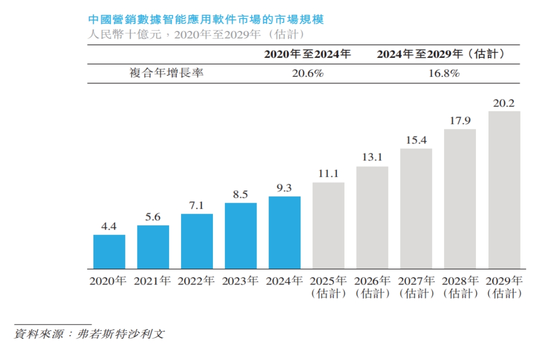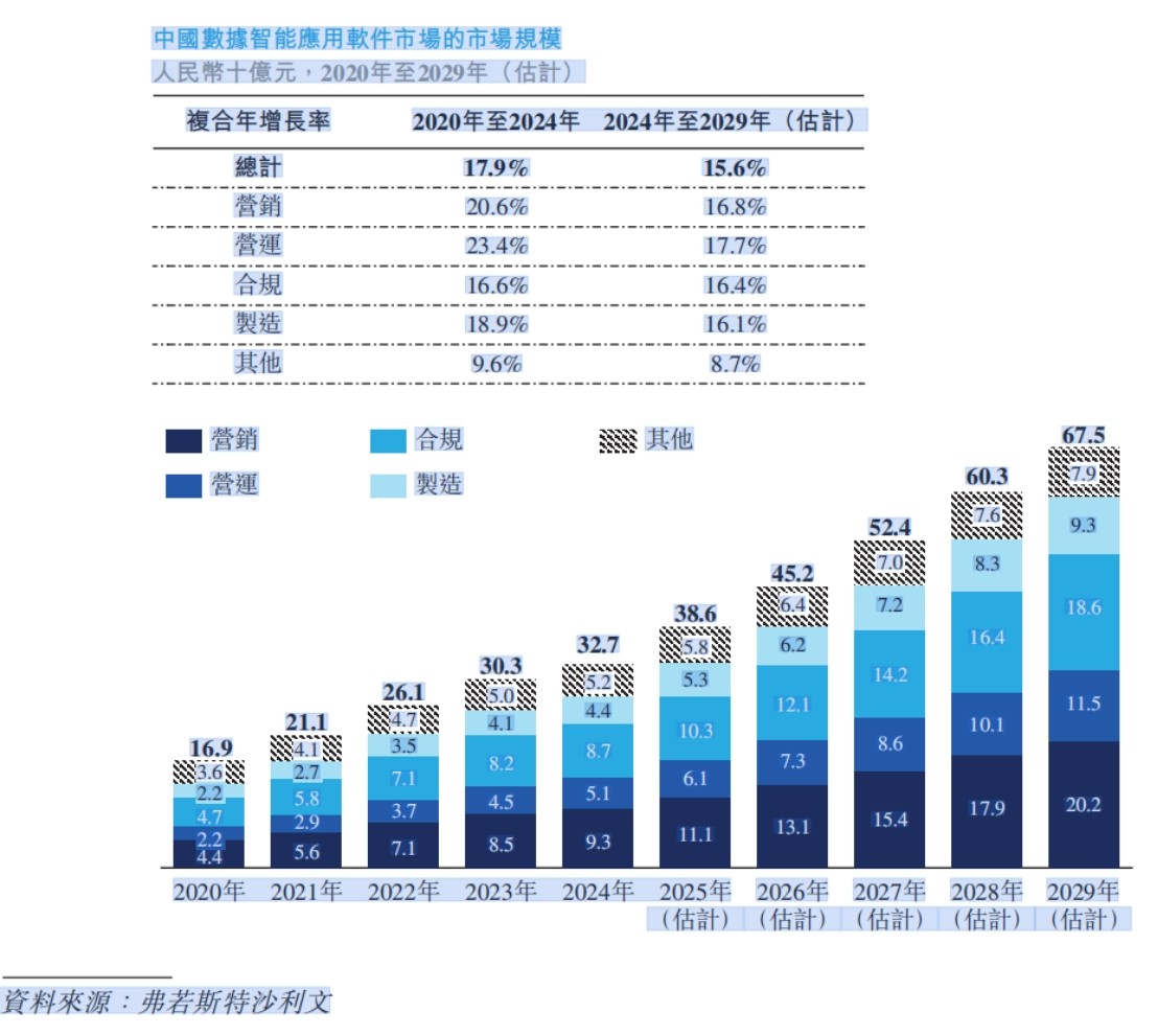 随着企业数字化转型步伐加快,数据智能应用软件市场正成为中国数字经济中增长最为迅猛的细分领域之一。据弗若斯特沙利文报告显示,该市场规模从2020年的169亿元增长至2024年的327亿元,复合年增长率达17.9%,预计到2029年将突破675亿元。在这一高速成长的赛道中,明略科技凭借其在营销与营运智能两大板块的领先布局,已成为行业龙头。按2024年收入计,明略科技是中国最大的数据智能应用软件供应商。