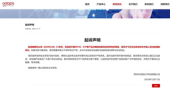 12月17日,针对市场诉讼传闻,深圳市灵明光子科技有限公司(简称“灵明光子”)通过其官方网站发布《起诉声明》(下称《声明》),称就速腾聚创公司(02498.HK)E1系列,包括但不限于E1R、E1P等产品涉嫌侵犯其发明专利权事宜,已正式向深圳市中级人民法院提起诉讼。灵明光子表示公司尊重并致力于保护知识产权,此次行动旨在依法维护自身的创新成果与合法权益。