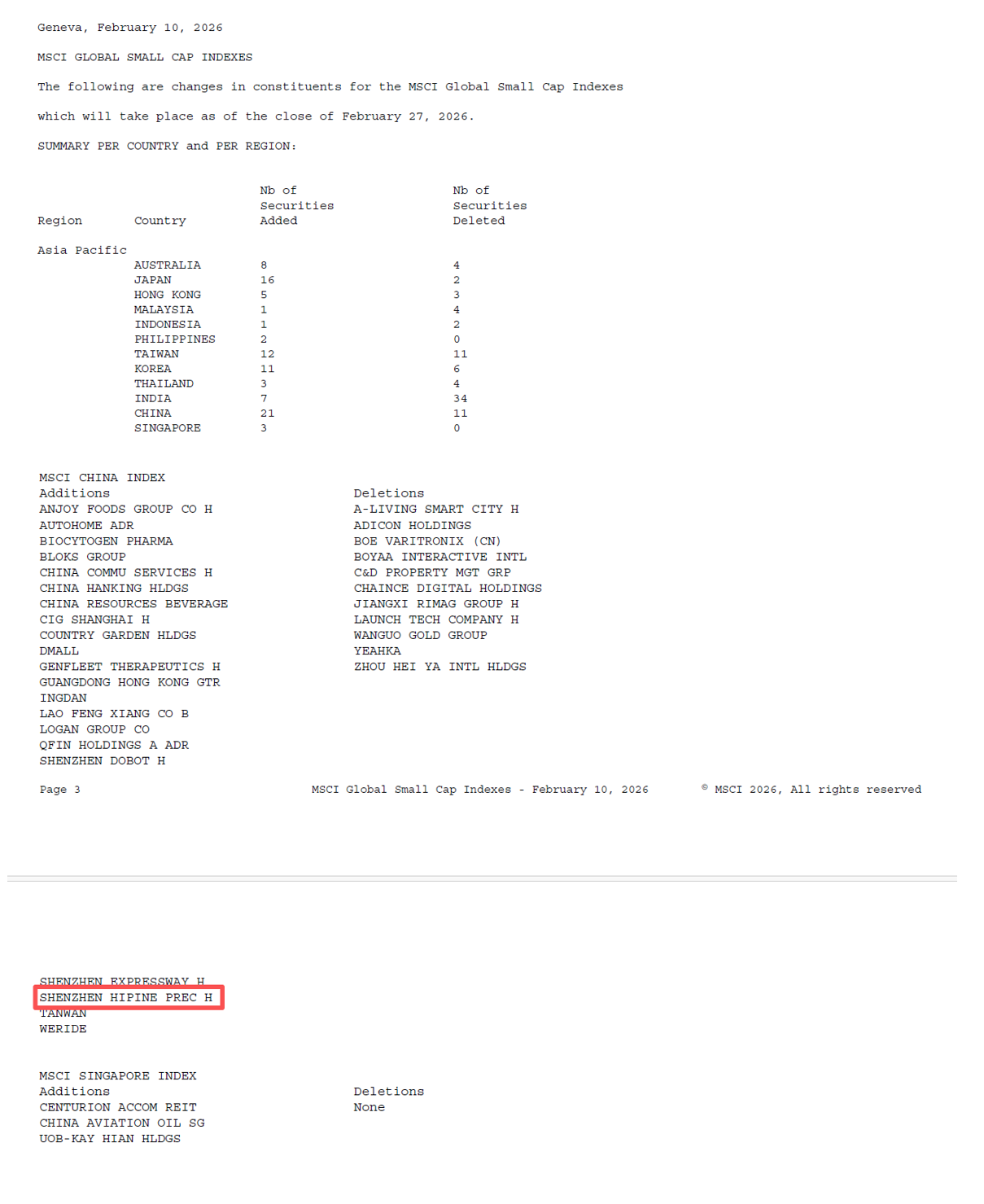 近日,全球知名指数编制公司MSCI于瑞士日内瓦公布最新指数调整结果,本次调整将于2026年2月27日收盘后正式生效。西普尼(02583.HK)成功获纳入MSCI全球小盘股指数。