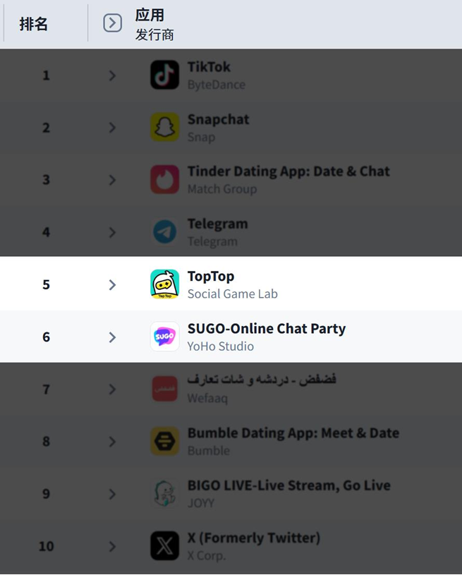在陪伴社交赛道,SUGO 已成为全球范围内备受瞩目的标杆型产品;TopTop 则凭借 UGC 生态优势,在沙特阿拉伯等中东北非部分市场逐步成长为「国民级应用」,并荣获 Sensor Tower APAC Awards 「最佳社交游戏平台」奖项。根据 Sensor Tower 数据,TopTop 和 SUGO 分别位列 2025 年中东社交网络收入排行榜第 5 位和第 6 位。