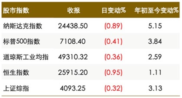 全球金融市场受中东局势恶化及通胀担忧影响,避险情绪再度占据主导。美股:随着美伊和谈迅速结束的希望破灭,加之软件行业面临AI颠覆的担忧以及喜忧参半的财报,三大股指集体收跌。债市:美债价格小幅下跌,收益率普遍走高。汇市:中东对峙局势的加剧削弱了和平预期,美元指数微涨,非美货币如欧元、英镑及日圆均震荡走弱。油市:供应中断隐忧导致油价再度急升,布伦特原油与美国原油涨幅均超过3%。金属市场:金价承压下跌,触及近期低位。