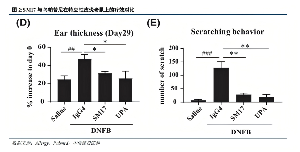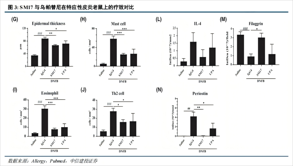 在产品研发方面,研报特别强调了SM17的进展。作为全球首个针对IL-25受体的抗体药物,SM17在特应性皮炎的Ib期临床试验中表现优异:接受600mg剂量静脉注射12周后,EASI75应答率达到75%,EASI90和IGA 0/1均为41.7%,疗效显著,且与剂量呈现明确的量效关系。这一结果在同类产品中具有差异化优势,未来有望填补现有皮下制剂疗法的空缺,II期临床数据值得重点关注。此外,临床前研究显示,SM17在炎症因子抑制上优于同类药物乌帕替尼,进一步印证了其潜在的竞争力。