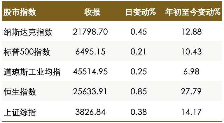 美国股市纳斯达克指数周三上涨1%,标普500指数亦收高,受助于谷歌母公司Alphabet股价飙升。美国公债价格上涨,收益率下跌,此前数据显示7月职位空缺数量减少,反映出劳动力市场趋软,强化了人们对美联储本月晚些时候降息的预期。同时,美元兑日圆和瑞郎下跌。油价下跌逾2%, OPEC+ 产油国联盟在上周末召开会议,决定在10月再次提高石油产量。金价延续创纪录涨势,挥之不去的全球不确定性使避险需求保持强劲。