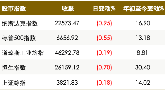 美国股市周二收跌,此前连续三个交易日创下收盘纪录新高,美联储主席鲍威尔表示,需要在未来的利率决策中平衡通胀担忧与趋弱的就业市场。美国公债收益率下跌。美元兑主要货币持稳。油价收高逾每桶1美元,因恢复伊拉克库尔德地区石油出口的协议磋商遇阻,缓解了部分投资者对全球供应过剩的担忧。金价创下纪录新高,受地缘政治不确定性及中国推动外国央行将黄金存放境内的双重因素驱动。