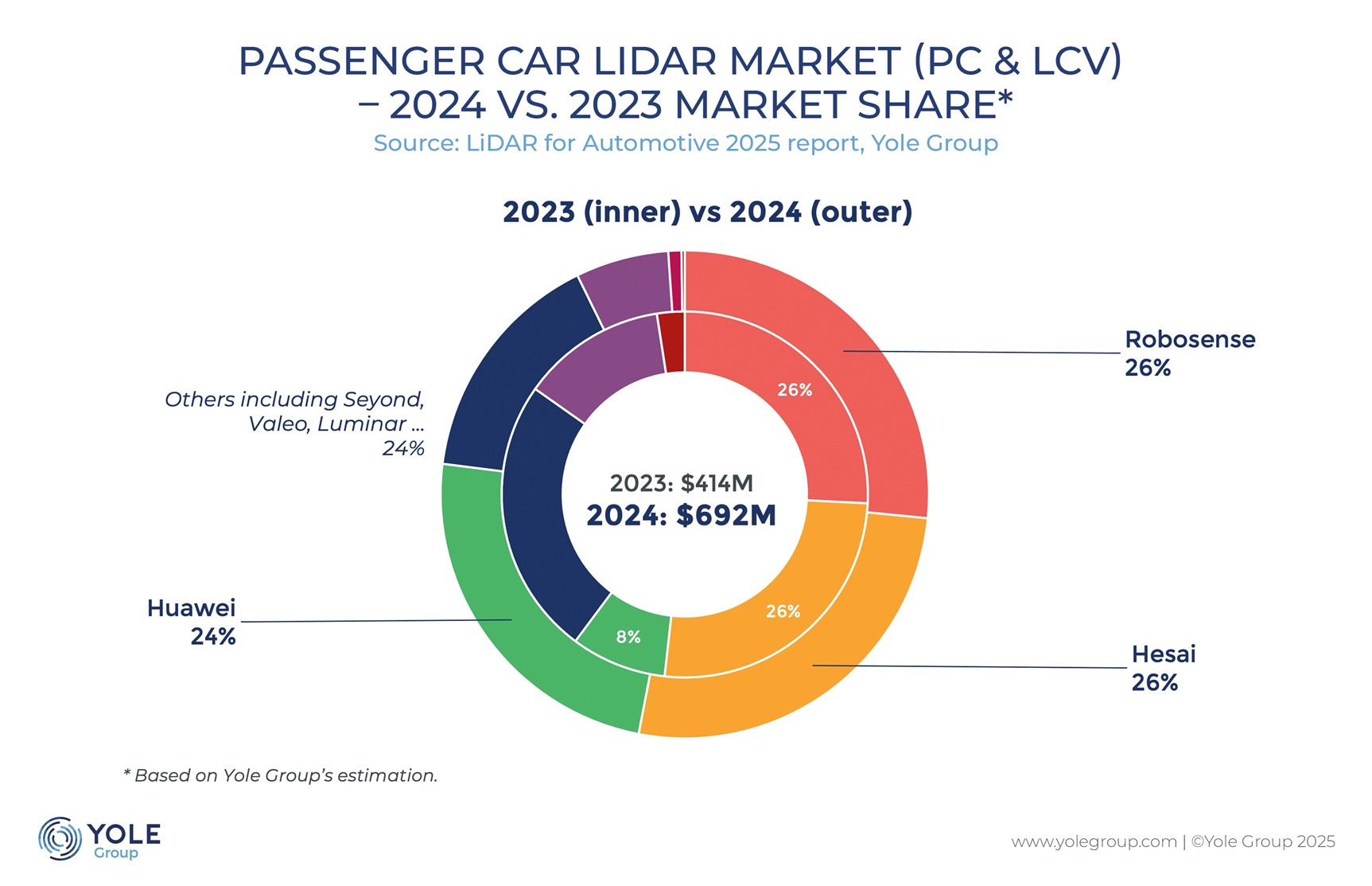 据《2025年全球车载激光雷达市场报告》显示,2024年全球车载激光雷达市场迎来爆发式增长,市场规模攀升至8.61亿美元,同比增长60%。在这一背景下,禾赛以33%的市场份额连续四年位居全球总营收榜首,在产品性能、量产交付及全球化布局上展现出强大的综合竞争力。