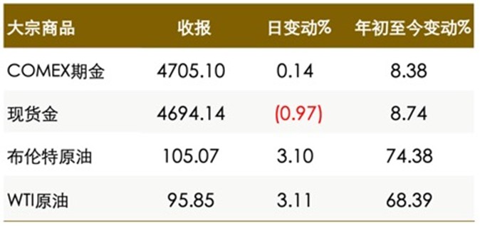 l 彭博美元指数跟随油价继续走高,日本财务大臣就日元疲弱走势发出警告。原油期货四连涨,伊朗局势升级迹象表明霍尔木兹海峡近期通航的前景黯淡。油价持续走高加剧投资者对通胀的担忧,黄金价格走低。