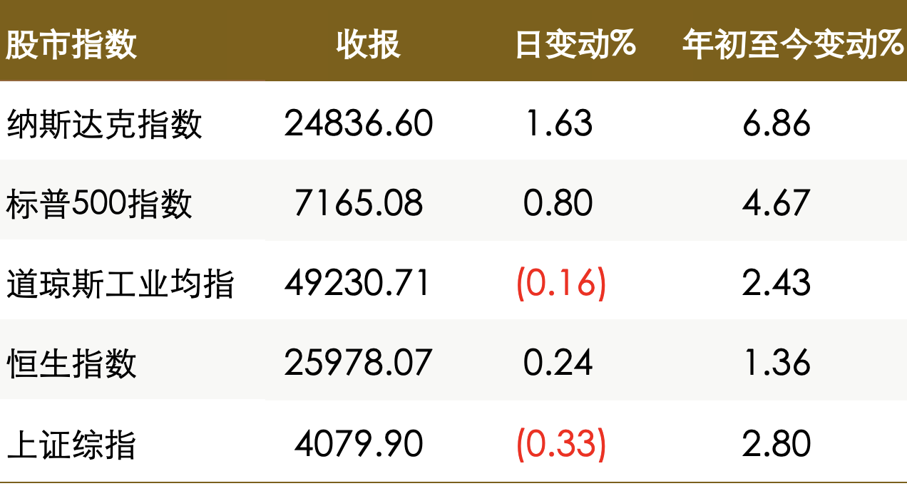 受英特尔股价大涨的提振,股市方面美股标普500和纳指双双收于历史高位。美国国债价格在震荡中走高,美元指数承压下跌,非美主要货币普遍走强。大宗商品方面,国际油价盘中剧烈震荡、收盘涨跌不一,但周线均录得大幅飙升;受持续的通胀担忧及美伊局势不确定性令市场保持警惕的影响,金价当日虽有上涨,但仍录得了近五周以来的首个周线下跌。